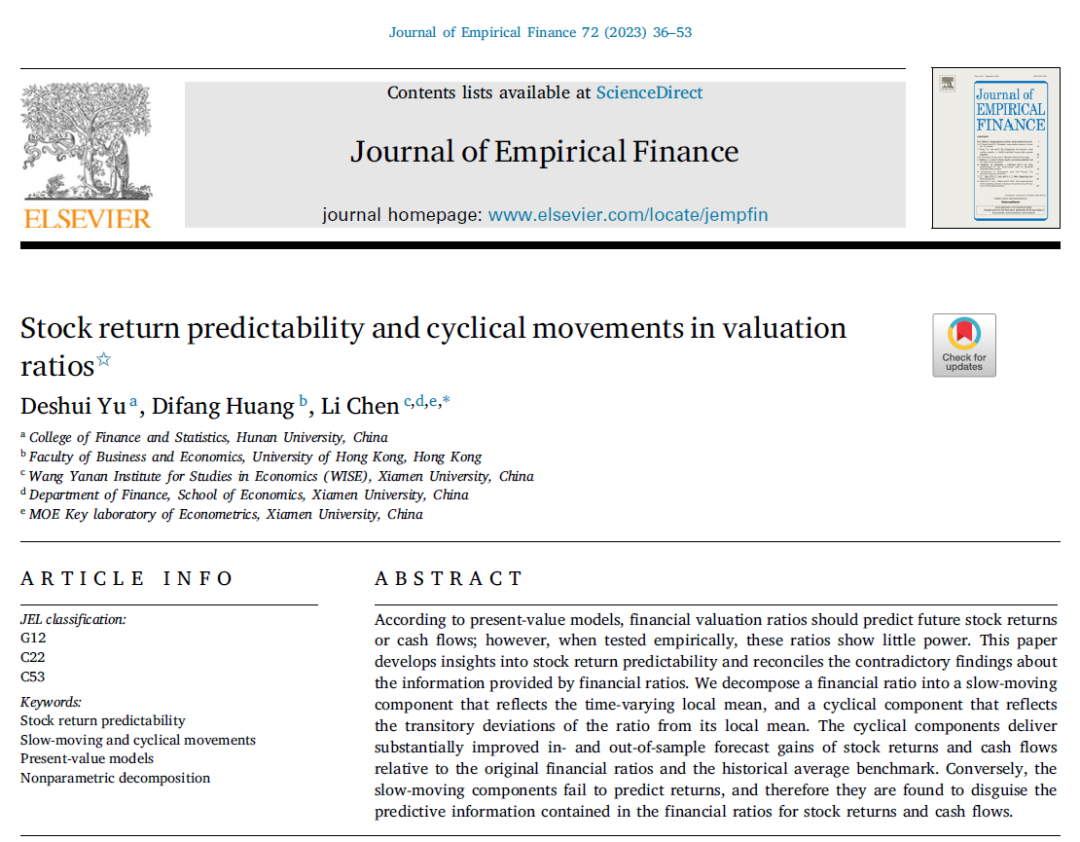近日,厦门大学经济学院金融系与王亚南经济研究院陈力助理教授,与湖南大学余得水助理教授和香港大学黄棣芳助理教授合作的关于股票收益率预测的论文“Stock return predictability and cyclical movements in valuation ratios”在金融学国际重要期刊Journal of Empirical Finance正式发表,于2023年6月第72卷刊出。