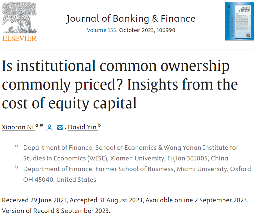 近日,厦门大学经济学院金融系、王亚南经济研究院倪骁然副教授与美国迈阿密大学(俄亥俄)殷思睿(David Yin)助理教授撰写的学术论文“Is institutional common ownership commonly priced? Insights from the cost of equity capital”在金融学国际重要期刊Journal of Banking and Finance发表,于2023年10月在第155卷正式刊出。