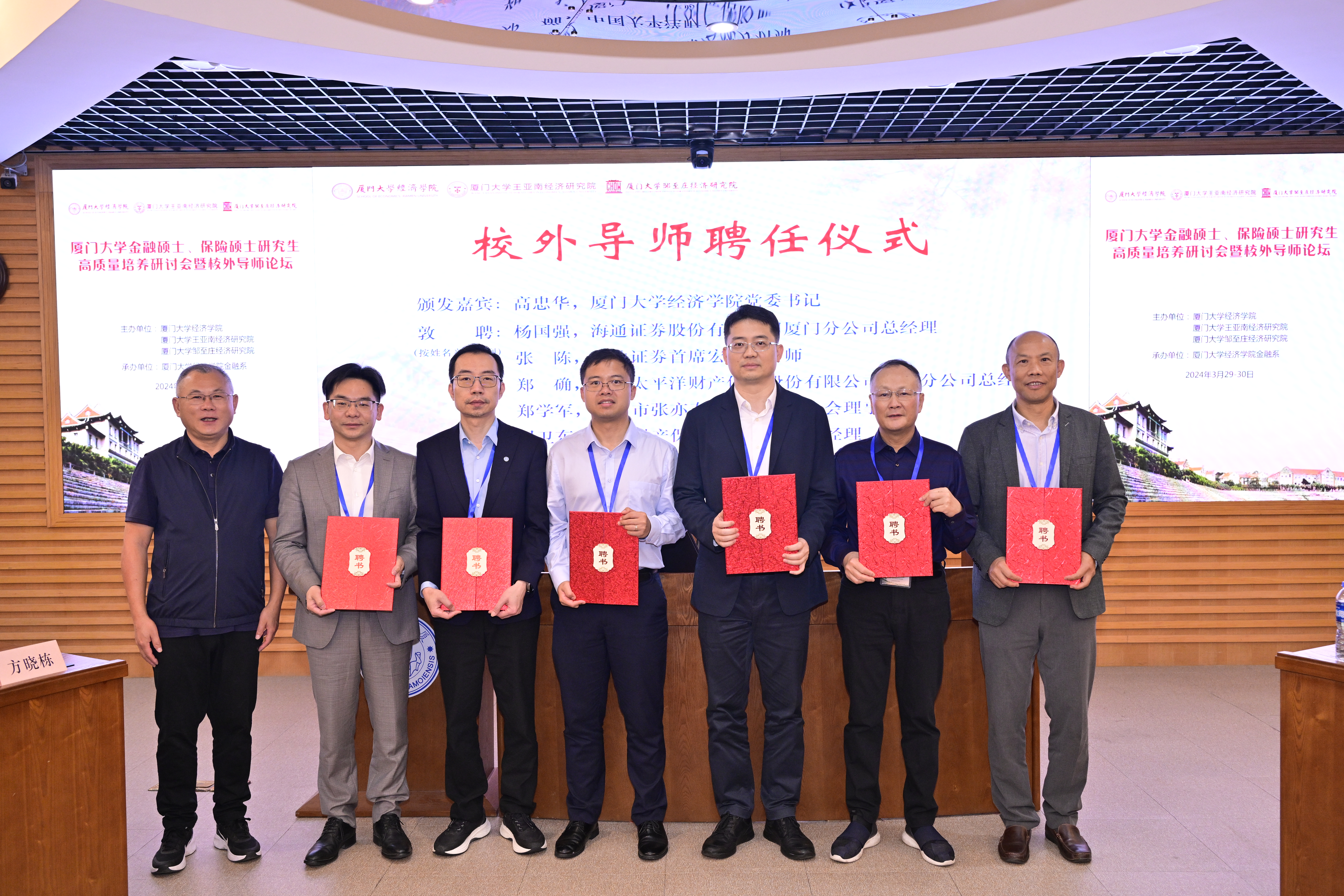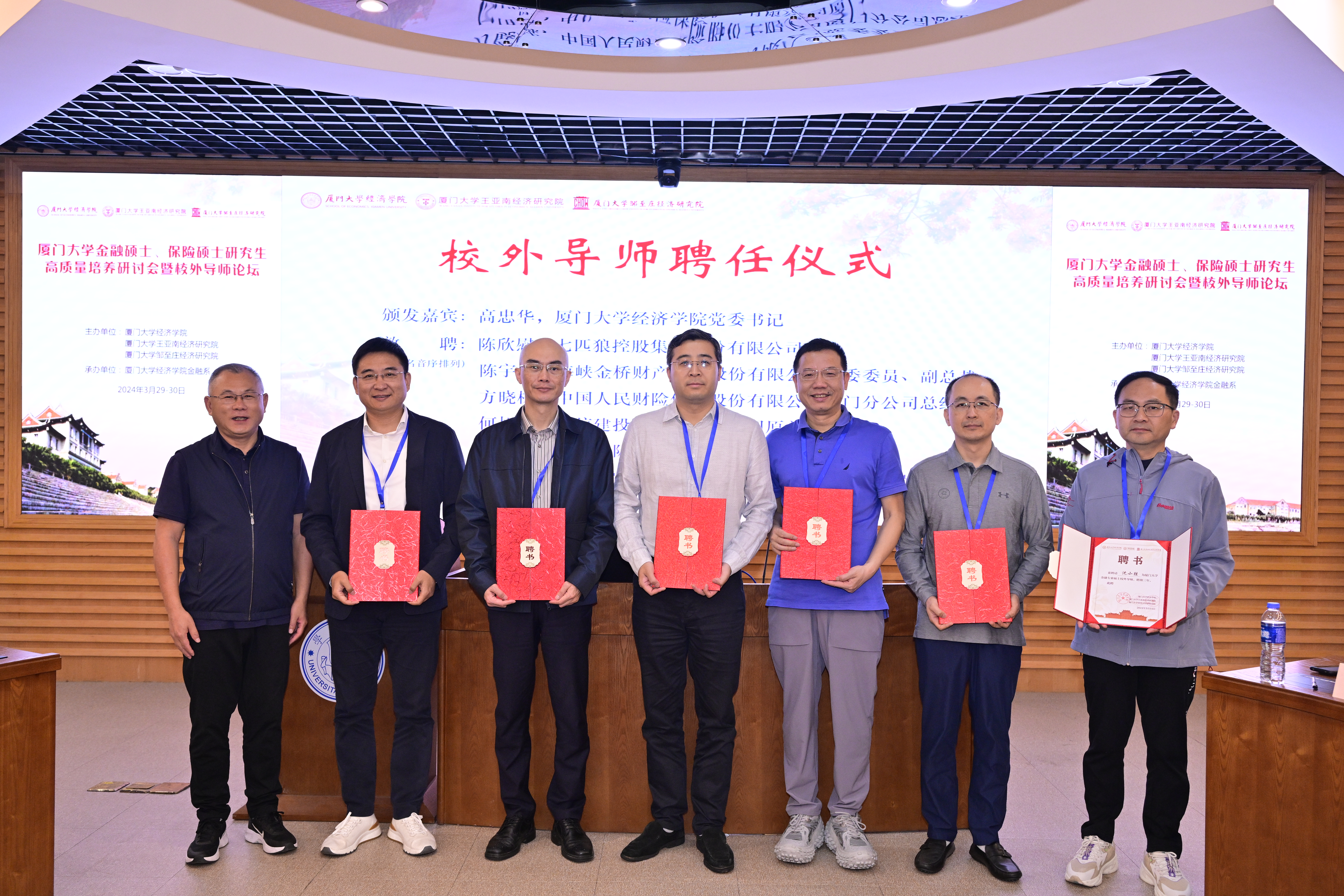 在陈海强教授的主持下,厦门大学金融硕士、保险硕士校外导师敦聘仪式举行。高忠华书记为12位续聘及新聘校外导师代表——七匹狼控股集团股份有限公司总裁陈欣慰,海峡金桥财产保险股份有限公司党委委员、副总裁陈宇宁,中国人民财险保险股份有限公司厦门分公司总经理方晓栋,中信建投证券厦门分公司原总经理何旭晖,厦门国际银行总行零售金融部高级专家沈小胜,上海协力(厦门)律师事务所执行主任吴大希,厦门金融租赁有限公司党支部书记、执行董事、总裁吴稷,海通证券股份有限公司厦门分公司总经理杨国强,东北证券首席宏观分析师张陈,中国太平洋财产保险股份有限公司厦门分公司总经理郑确,厦门市张亦春教育发展基金会理事长郑学军,富邦财产保险有限公司副总经理周卫东颁授聘书。