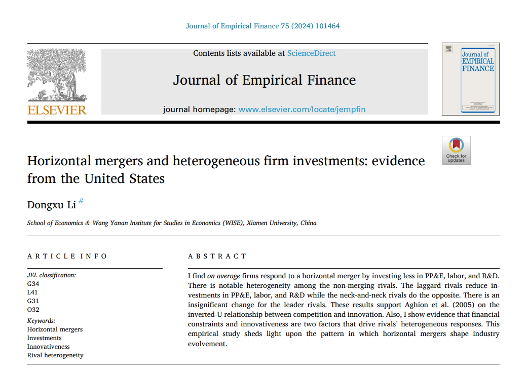 近日,厦大经济学院金融系、王亚南经济研究院李东旭助理教授独立完成的论文“Horizontal mergers and heterogeneous firm investments: evidence from the United States”在公司金融学国际重要期刊Journal of Empirical Finance发表,于2024年1月正式线上刊出。