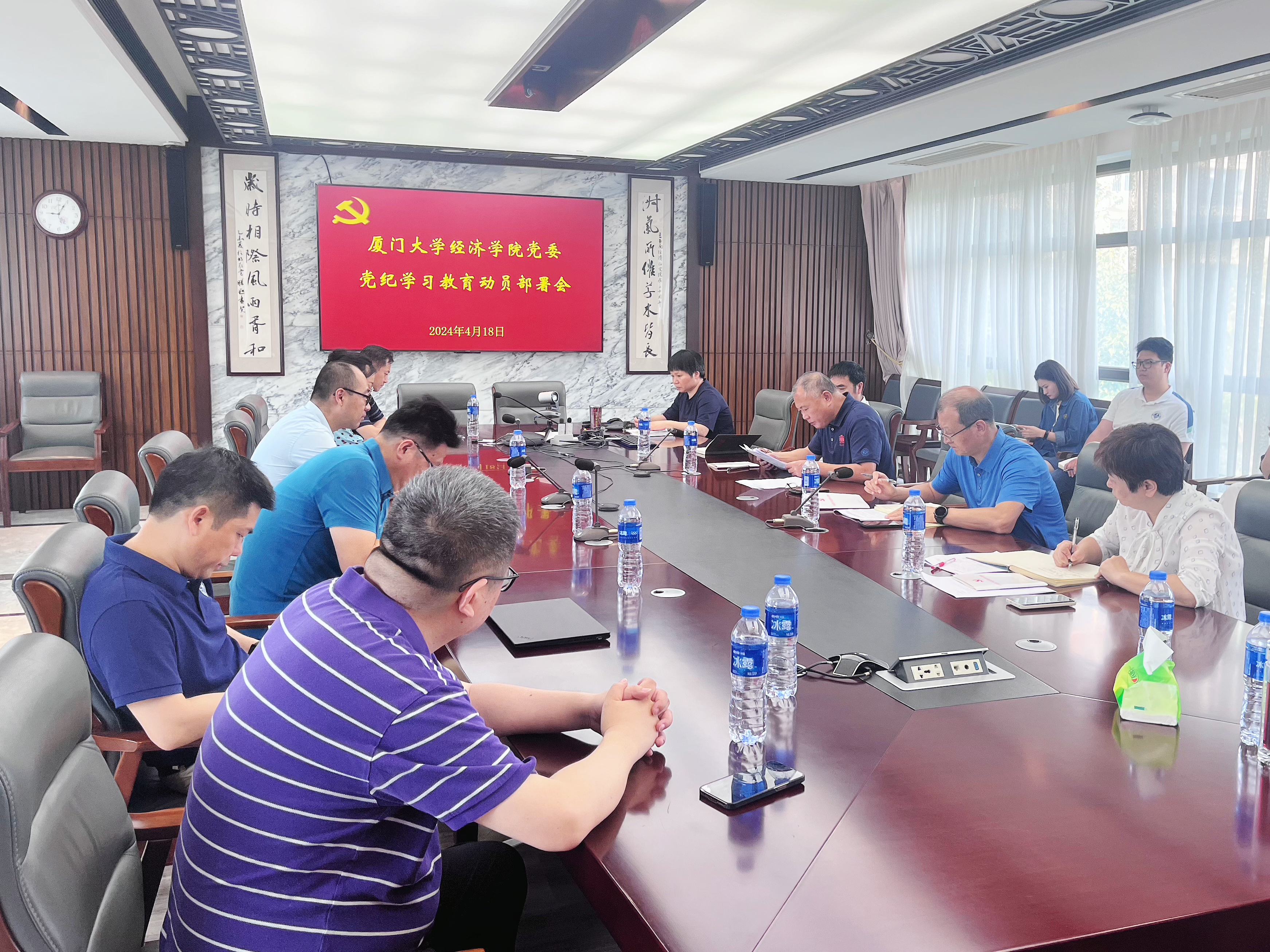 4月18日上午,经济学院党委在经济楼N501室召开党纪学习教育动员部署会,深入学习贯彻党中央关于在全党开展党纪学习教育的有关要求,对学科深入开展党纪学习教育进行动员部署。学院党委委员、师生党支部书记和辅导员参加会议。会议由院党委书记高忠华主持。